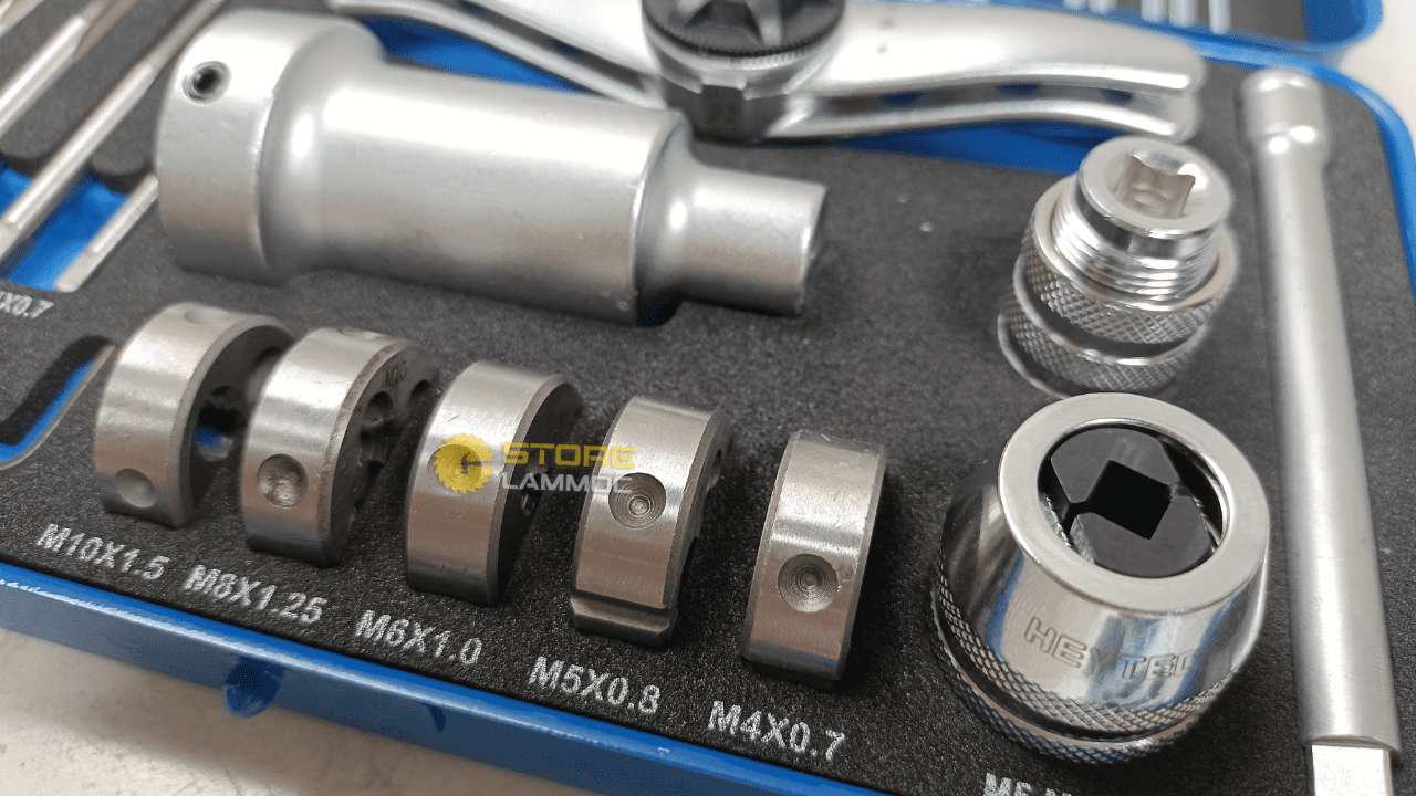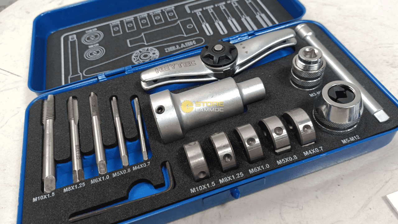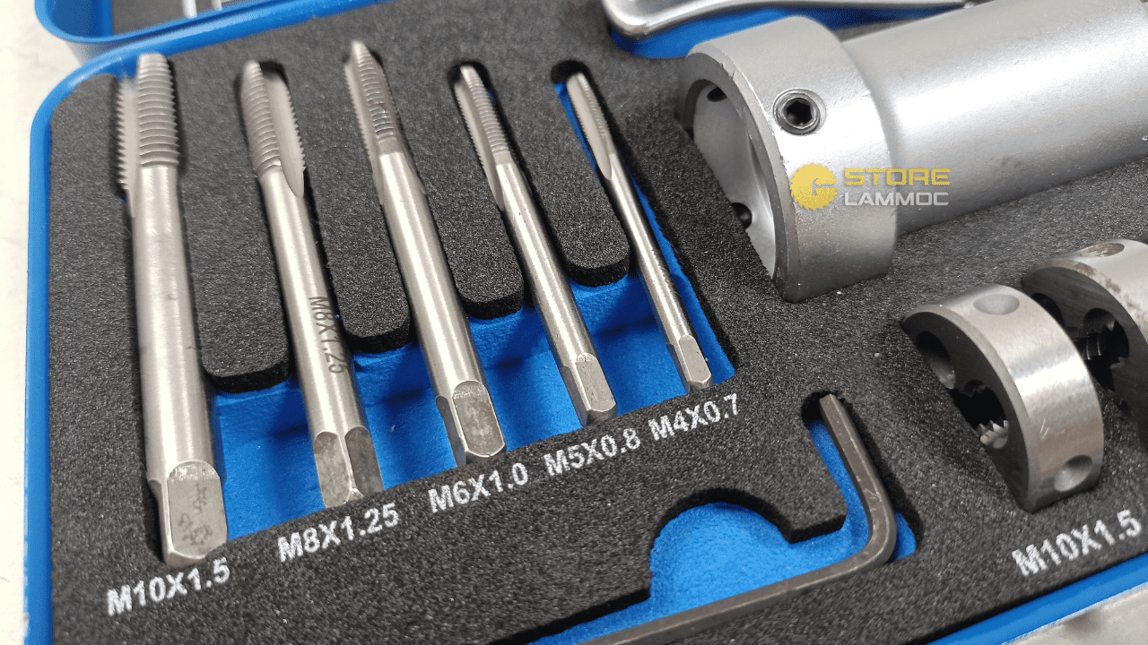 - 5 taro M4 - M10 - 5 bàn ren M4 - M10 - 1 đầu kẹp taro M3 - M8 - 1 đầu kẹp taro M5 - M12 - 1 đầu kẹp bàn ren 1 tay quay tự động 1/4" - 1 cần nối dài 100mm - 1 lục giác |